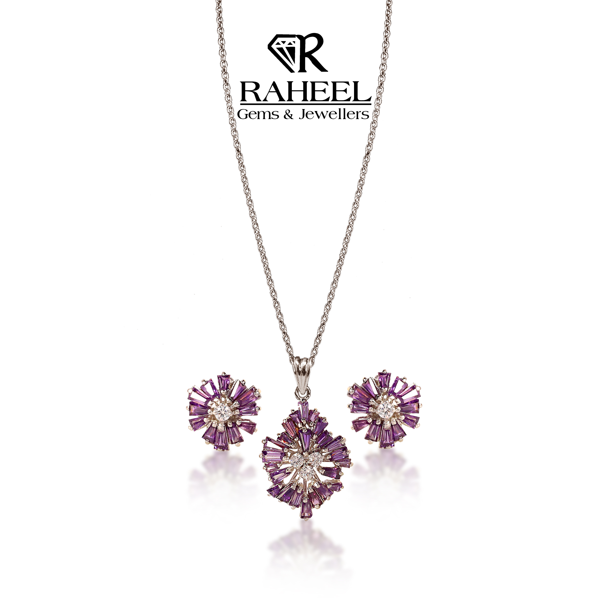 Discover the perfect fusion of contemporary style and traditional value with our 21kt Gold Amethyst Pendant Set. Exclusively available at Raheel Gems & Jewellers in The Plaza Shopping Mall, Do Talwar, Karachi, this set features a vibrant sunburst of baguette-cut amethysts accented by shimmering zircons. The base is crafted from high-purity 21kt gold and treated with a premium silver polish (rhodium) to offer a modern, sophisticated white-metal look.